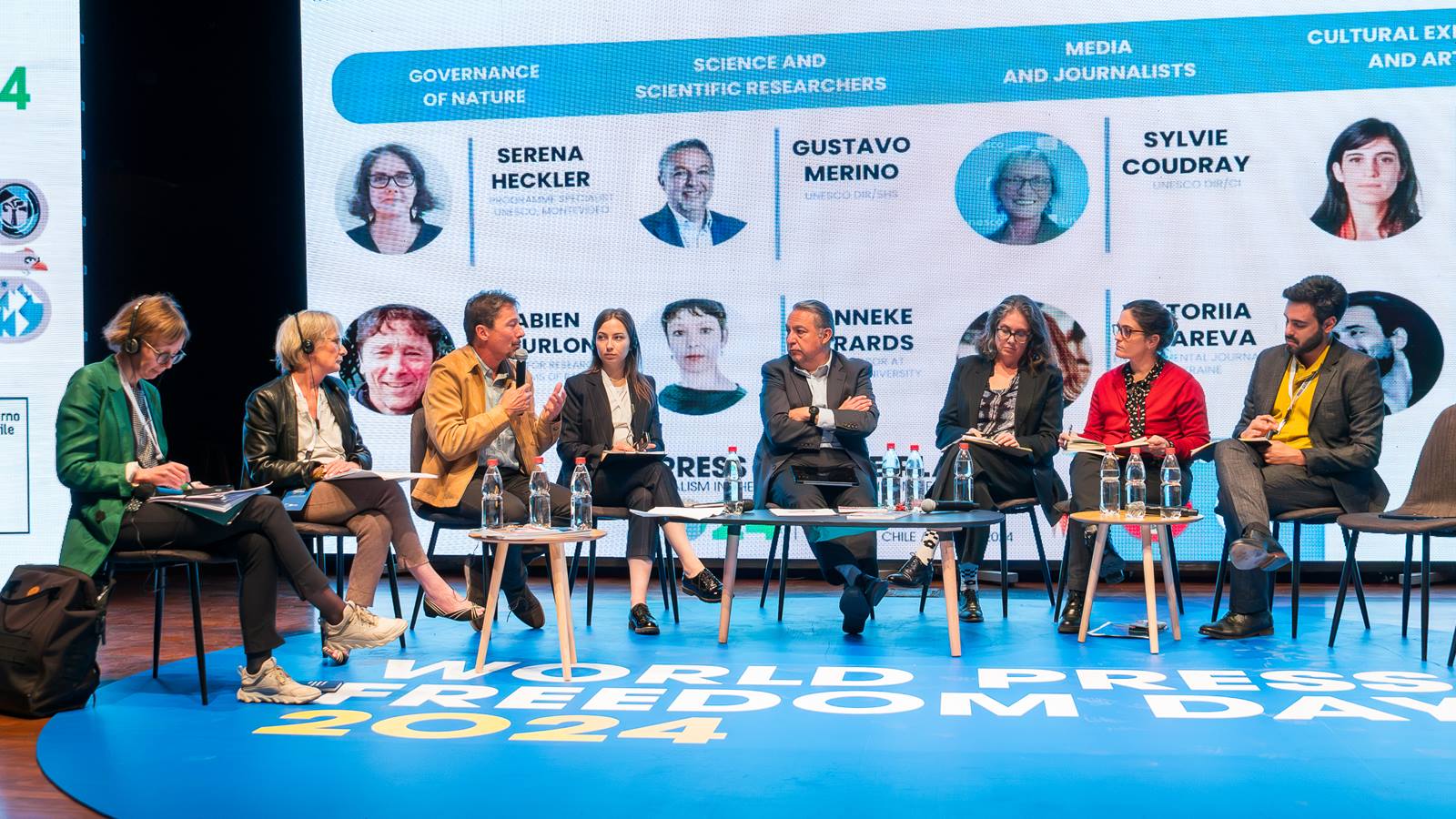 This panel discussed the critical role that journalists play in combating misinformation and disinformation, and the threats they face, especially in times of planetary crises. Panellists discussed UNESCO's initiatives to protect journalists and highlighted the challenges faced by environmental journalists, particularly in conflict zones.